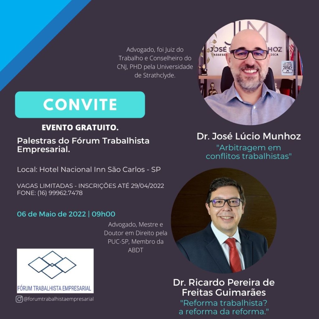 Nessa Sexta-feira, dia 06 de Maio, estaremos palestrando presencialmente na cidade de São Carlos, SP, sobre Arbitragem Trabalhista, em evento promovido pelo Fórum Trabalhista Empresarial, sob a coordenação do Dr Nilson Pompeu.
